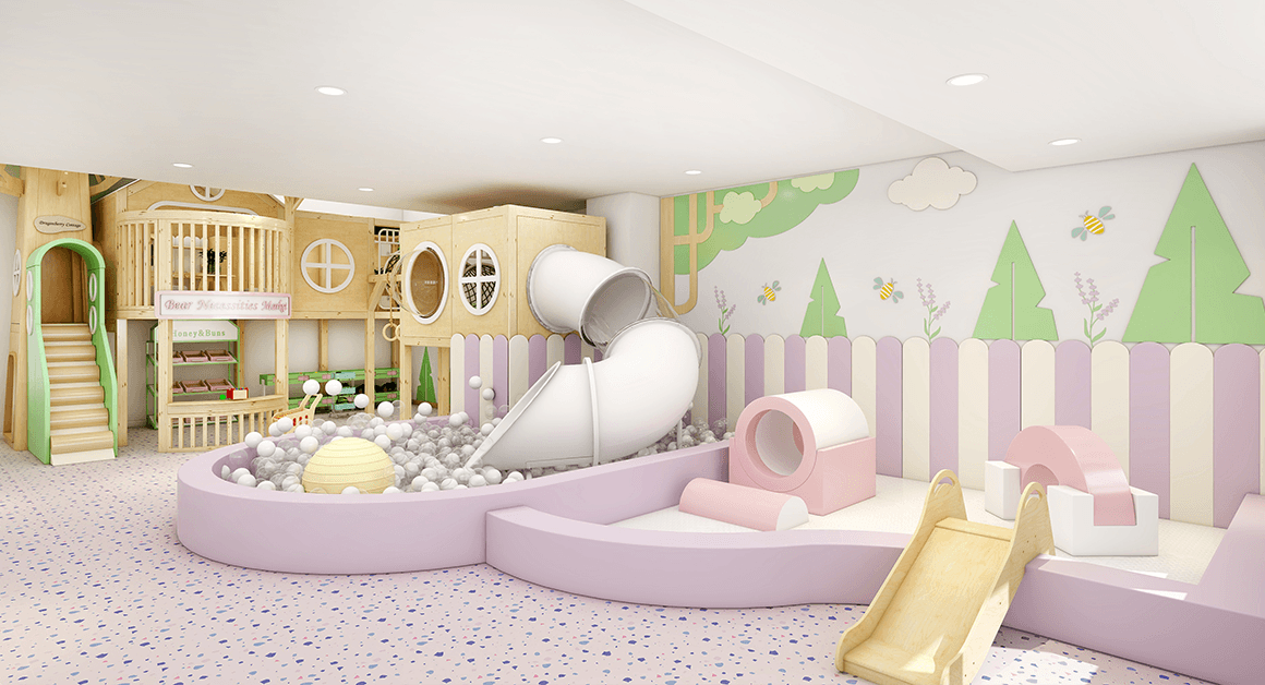 The indoor playground's recreational area is divided into four functional areas: a children's play area, a children's soft play area, a role-playing area and a physical development area.