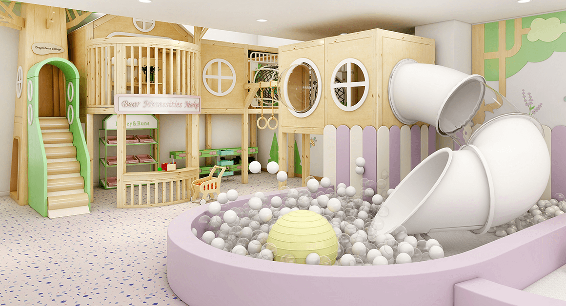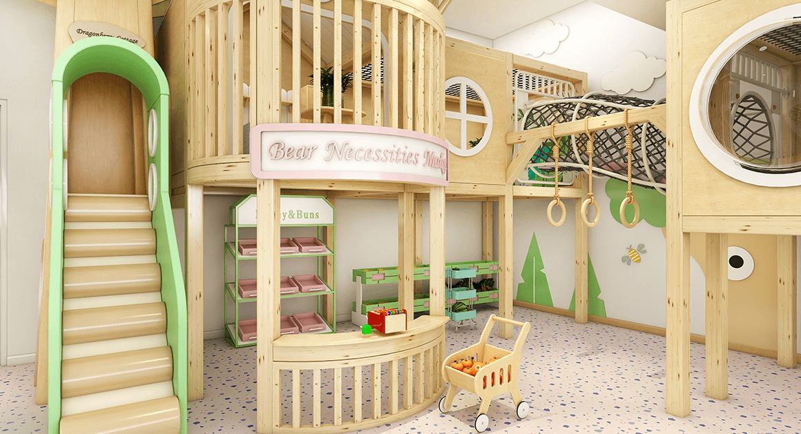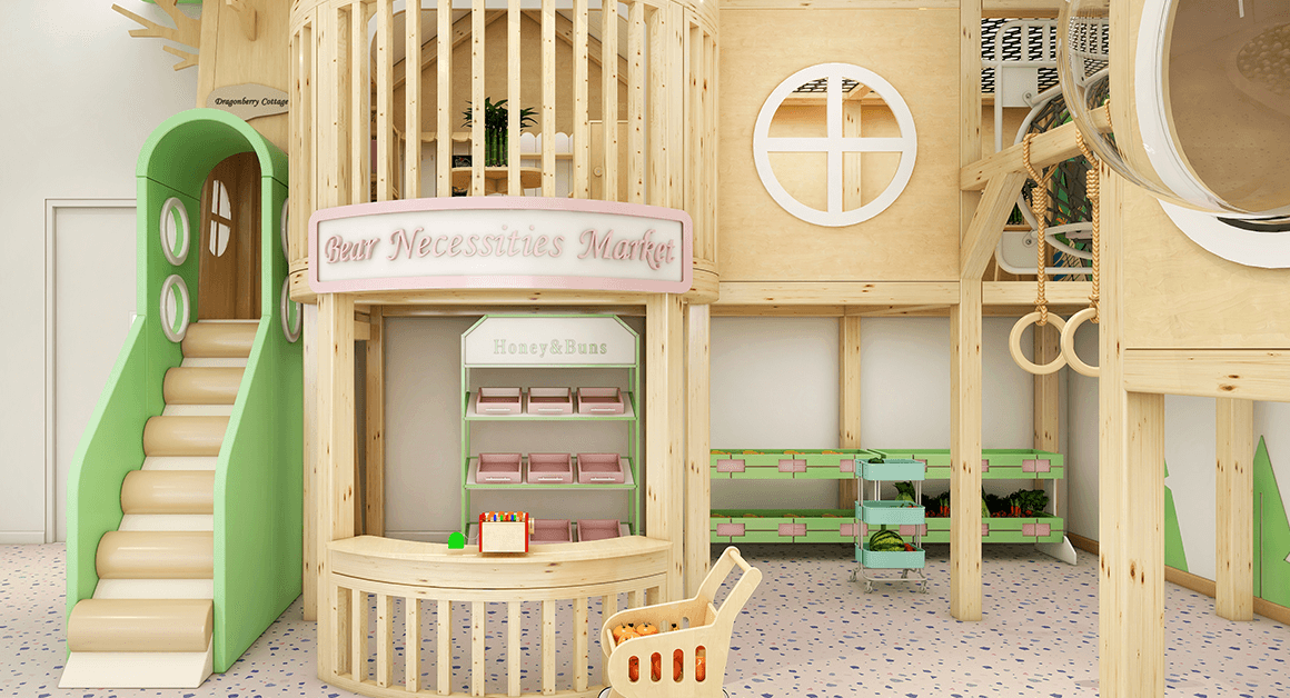 Three Bears' Home: Indoor playground equipment in this area features a natural forest theme, with three-bear home including a living room for the bears to relax, a tree house for them to climb, and a bear market.