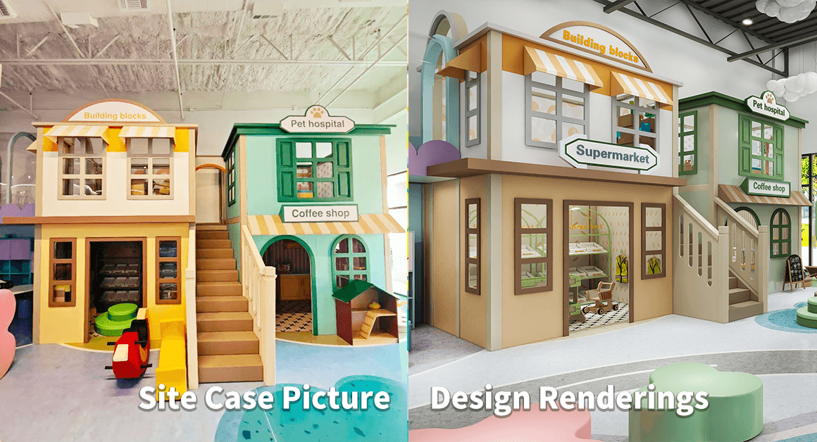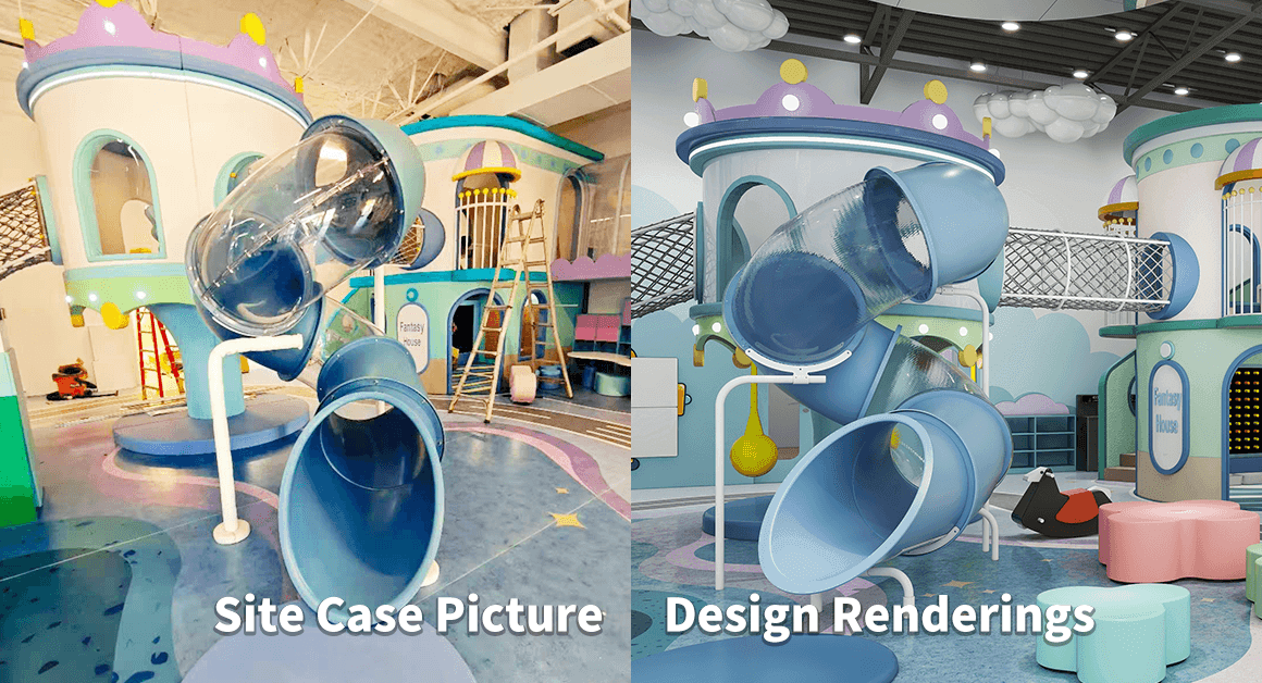 Design: A two-story castle with a supermarket, café, fire station, and princess room on the first floor, and a construction site, animal clinic, police station, and dress-up room on the second. Acrylic tunnels, stairs, and nets connect to other zones. An outdoor farm-themed section lets kids harvest pretend crops and care for toy animals.