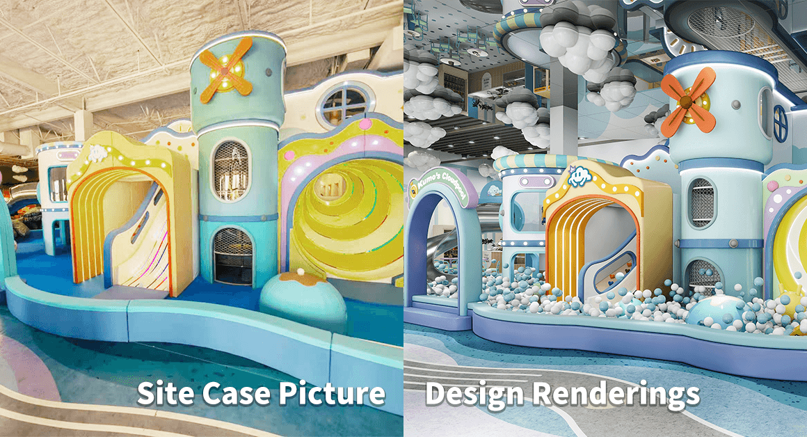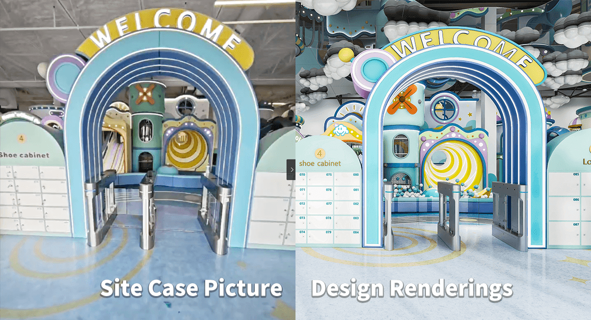 Design: A safely enclosed space with full soft flooring. Kids enter through a rainbow arch tunnel into a friendly rocket ship, then slide into a ball pool. The area also includes sensory panels and interactive wall games.