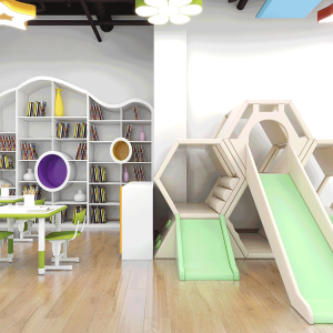Meanwhile, the Theme Ball Pool Area features a ball pool filled with vibrant balls and is linked to a wooden house playground consisting of slides, a rock climbing area, and a trampoline, whereas the Role-play Area combines supermarket and kitchen role-play spaces, allowing children to experience two distinct theme scenes. Second, the Baby Area is designed for parent-child interaction and is equipped with some quality building blocks. Third, the Reading Area contains a stems wall and  several high-quality hardwood tables and chairs, which assist children grow their brains.