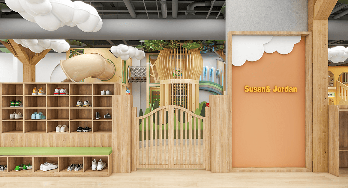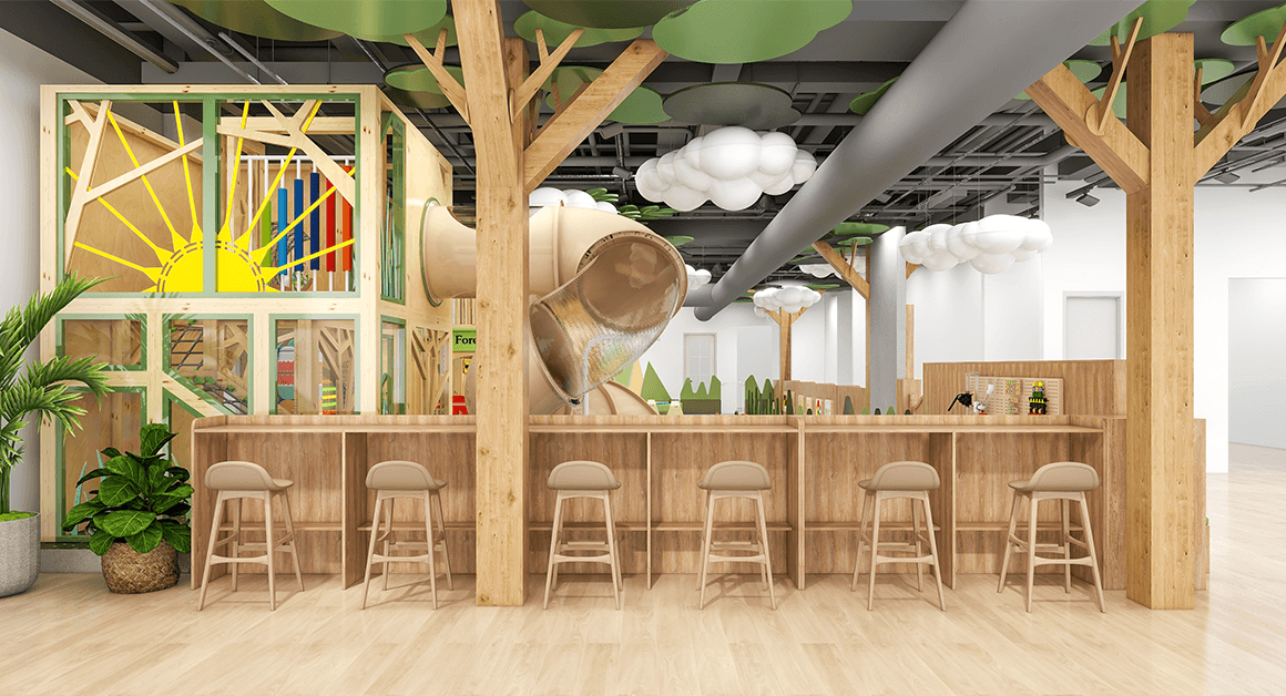 The welcoming entry features shoe storage and seating, leading to a café counter where parents can relax with a drink while enjoying a full view of the play area. This zone enables efficient crowd management and supervision, allowing parents to socialize, rest, or observe their children in a comfortable setting.