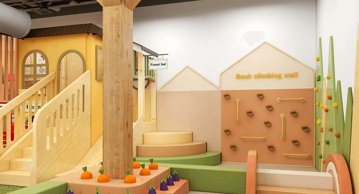 Accessible via rainbow steps from the sensory zone, this area includes soft climbing walls designed as mini-hills and cottages, all atop thick foam flooring. It serves as a transitional zone offering moderate climbing challenges to build strength, coordination, and confidence, leading seamlessly to the main play structure.