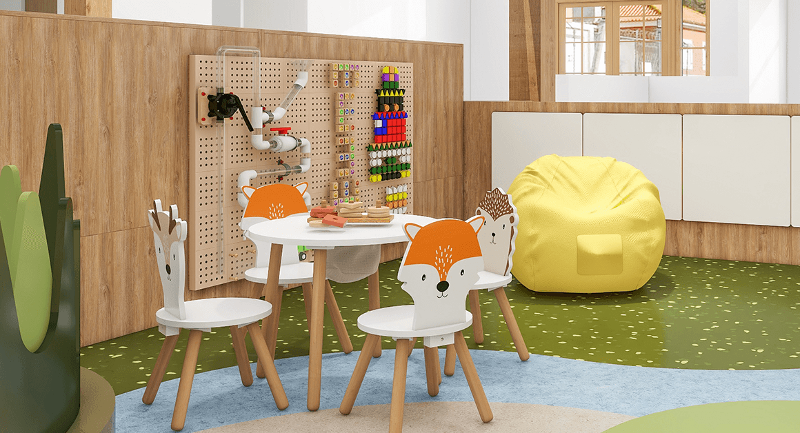 Utilizing the backside of the café and storage units, this zone includes magnetic drawing walls, gear panels, and fantasy track walls. Animal-shaped chairs and cozy beanbags provide seating, creating a creative corner for quiet play, drawing, puzzles, and parent-child reading that stimulates imagination and focus.